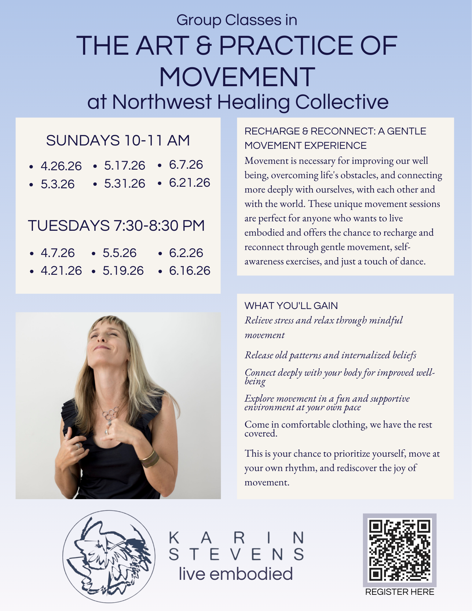 Come in comfortable clothing, we have the rest covered. This is your chance to prioritize yourself, move at your own rhythm, and rediscover the joy of movement.